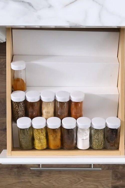This is a great example of organizing a kitchen drawer. Usually, we use a divider to organize the drawer, but here, with your creative thinking, you can organize spices smartly.