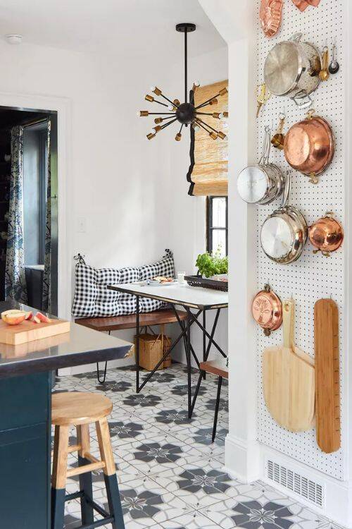 Use a pegboard and hang all the kitchen utensils. You can hang cookware, pots, a cutting board, and many utensils. It will accessorize your kitchen wall.