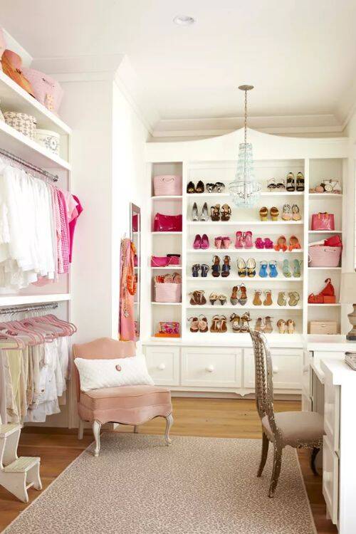 The pink chair goes well with the entire closet area. The rug also complements it. Everything is neatly organized in this closet area.