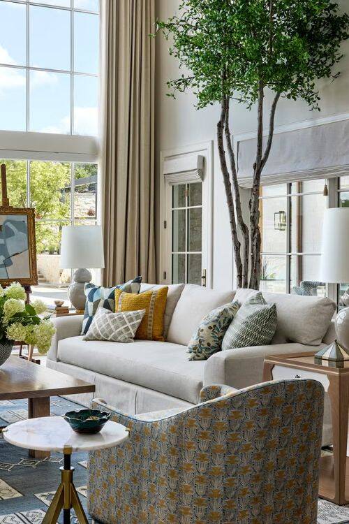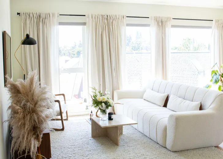 For a floor-to-ceiling window, hang the curtains from the top of the ceiling to the floor. The light colored curtain blends seamlessly with the wall decor. The greenery has taken the decor to the next level.