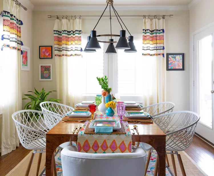 They made the room colorful. The white color chairs and the wooden dining table bring a lot of elegance to the dining room. The colorful pots in the middle make the entire decor colorful.