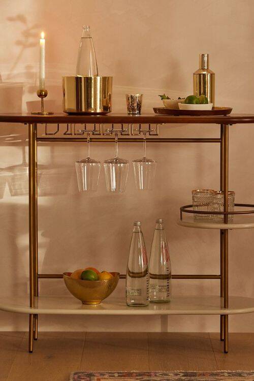 This bar stand with golden legs looks elegant. It looks high end and the best part is it’s clutter-free. There are things on the top shelf. The candle makes it even classier.