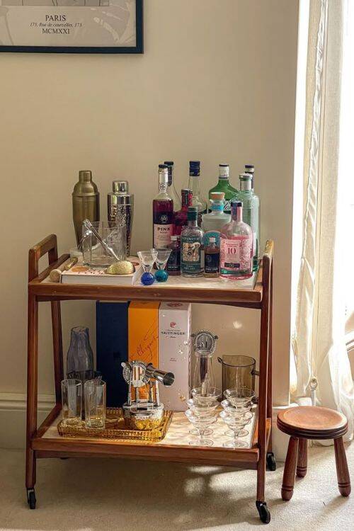 By keeping all bar cart essentials in one place you will turn it into a party hub and all your guests will gather around it. The flowers at the top of the cart look beautiful.