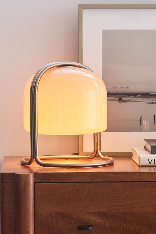 The white shade emits a soft light that blends with the ambiance.