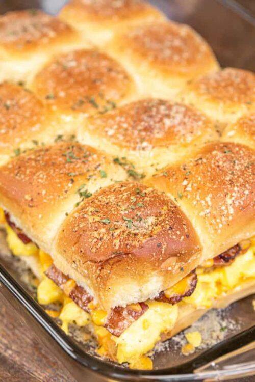The ingredients include bacon, heavy cream, Hawaiian rolls, butter and cheddar cheese.