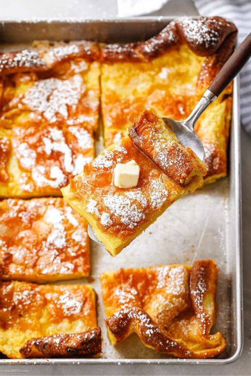 The ingredients include milk, all-purpose flour, salt, eggs and butter.