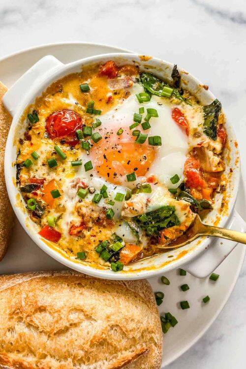 The ingredients include grape tomatoes, thyme, oregano, eggs and feta cheese.