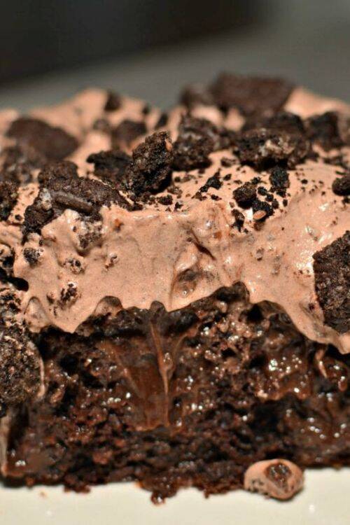 The ingredients include chocolate cake mix, Oreos, milk, chocolate instant pudding mix and hot fudge.