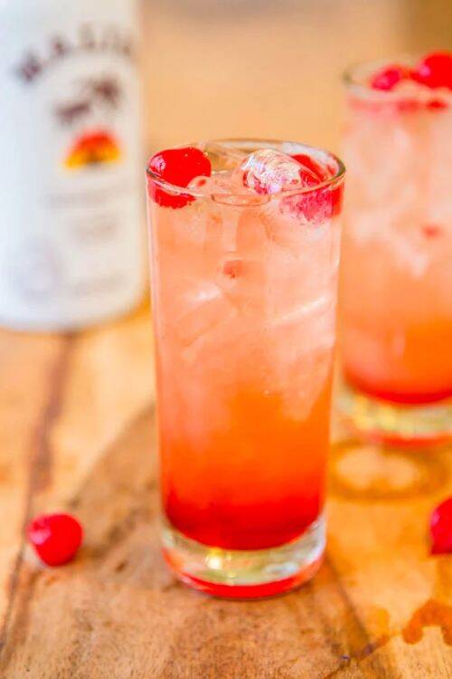 The ingredients include maraschino cherries, pineapple-orange juice, grenadine and Malibu coconut rum.
