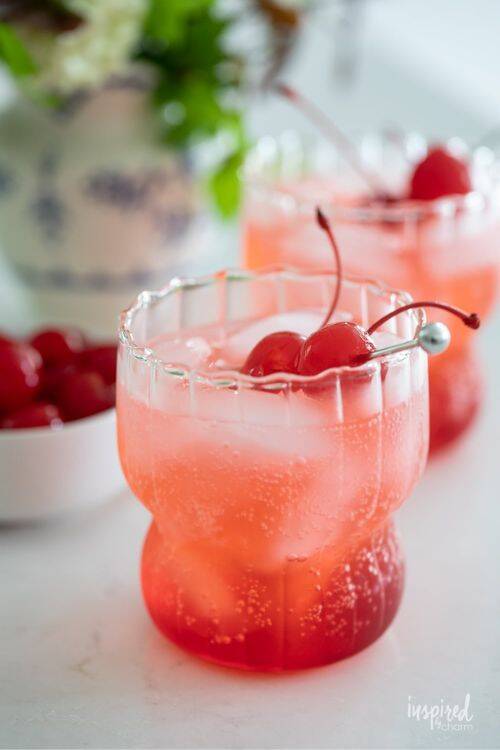The ingredients include vodka, lemon lime soda, grenadine and maraschino cherries.