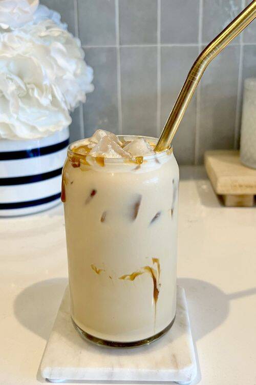 The ingredients include caramel sauce, espresso shots, vanilla syrup, ice and half & half.
