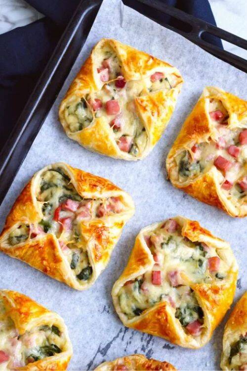 The ingredients include ham, puff pastry, Swiss cheese, milk and all purpose flour.