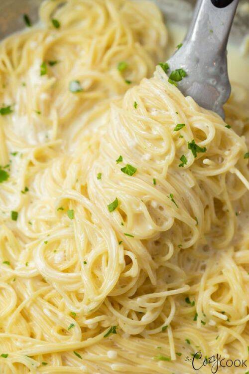 The ingredients include Parmesan cheese, garlic, angel hair pasta, butter and milk.
