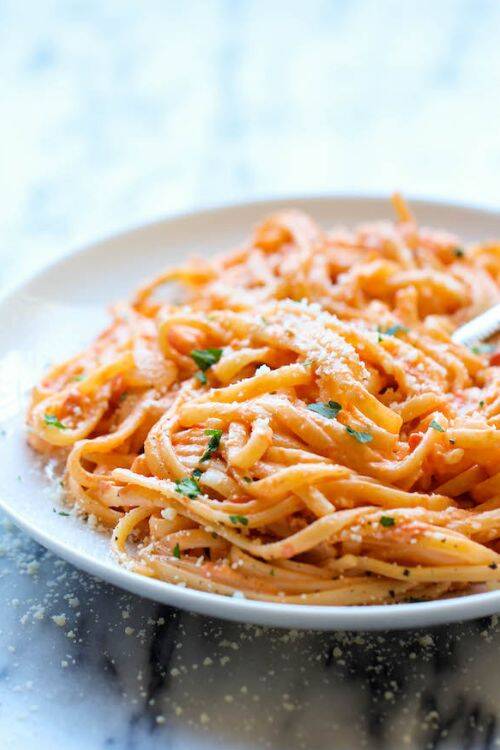 The ingredients include roasted red peppers, linguine, olive oil, heavy cream and milk.