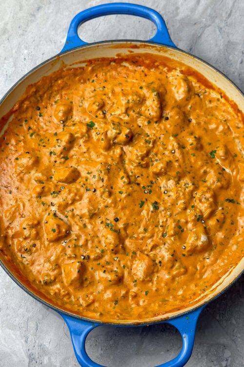 The ingredients include chicken thighs, curry powder, sweet paprika, Greek yogurt, heavy cream, and garlic powder. Instead of chicken, you can use turkey too. For veggie lovers, tofu is your best option.