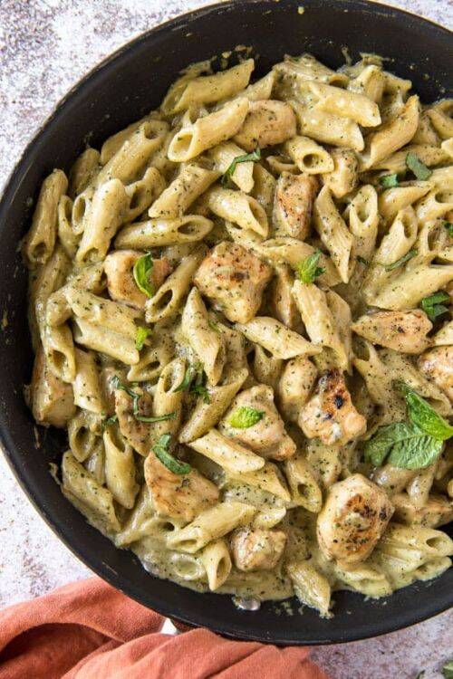 The ingredients include penne pasta, basil pesto, chicken broth, butter, Italian seasoning, all-purpose flour, chicken breast, parmesan cheese, and mozzarella cheese.