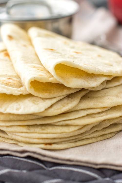 The ingredients include shredded chicken, sour cream, cumin, chili powder and flour tortillas.