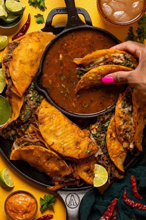 The ingredients include salsa, beef chuck roast, cumin, chili powder and corn tortillas.