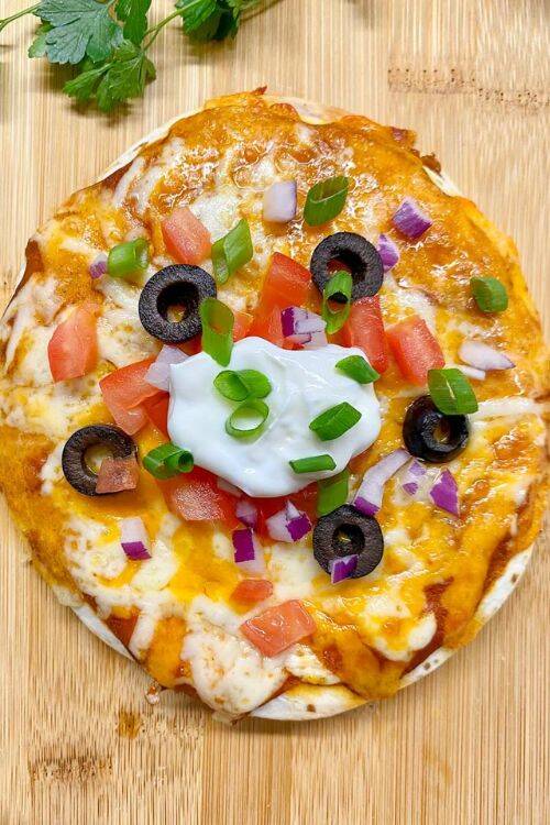 You need to preheat the oven to 375 degrees Fahrenheit. With a combination of ground beef, tortillas, olives, sour cream you can make this delicious pizza.