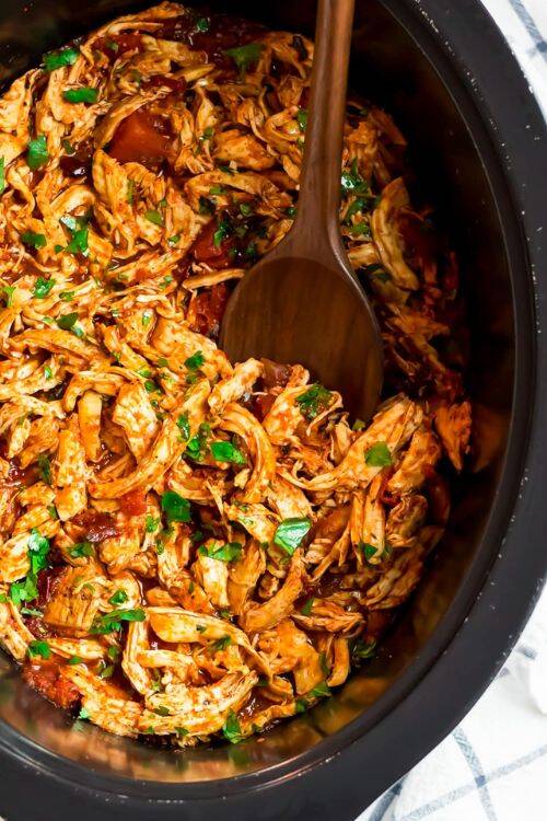 As with all the slow cooker recipes, this will also take a few hours to prepare, precisely four and a half hours. You need to cook it at 165°F. With a mix of boneless chicken breasts, garlic, onion, pepper you can make this mouth-watering dish.