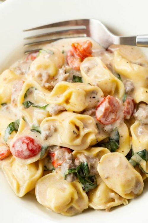 The ingredients include pasta, tomatoes, basil, half & half and ground sausage.