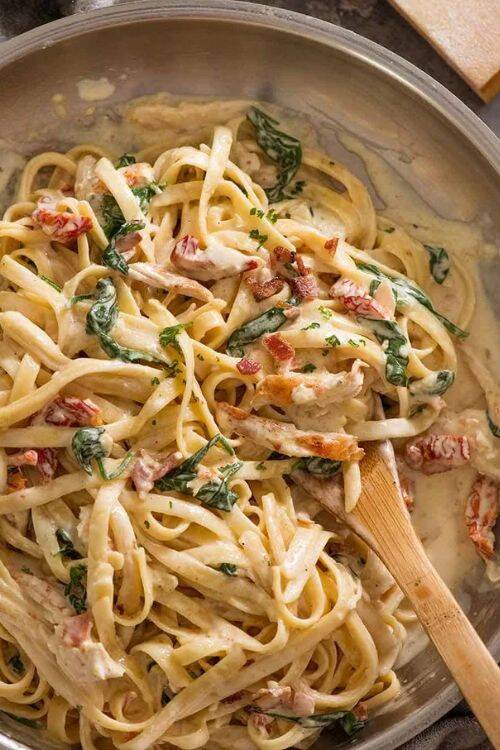 The ingredients include fettucine, chicken breasts, Parmesan cheese, baby spinach and dry white wine.