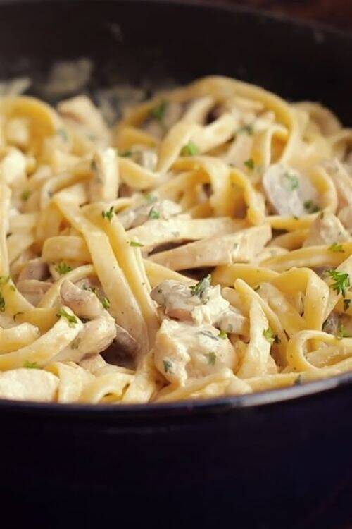 The ingredients require garlic, onion, chicken breasts, fettuccine pasta, parsley and olive oil.
