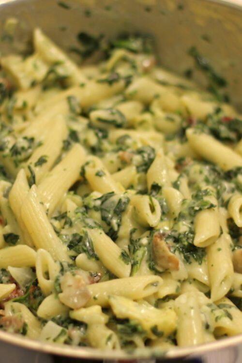 The ingredients include penne pasta, spinach, artichoke hearts, garlic and bacon.