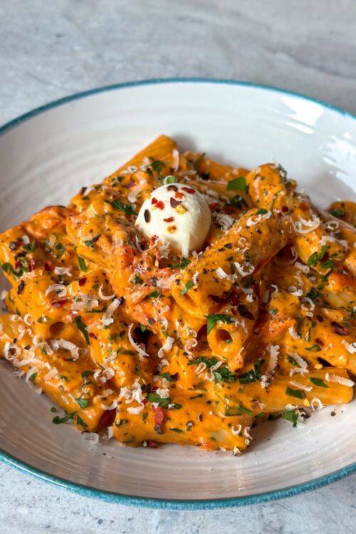 The ingredients include cherry tomatoes, parsley, rigatoni pasta, chili flakes and heavy cream.