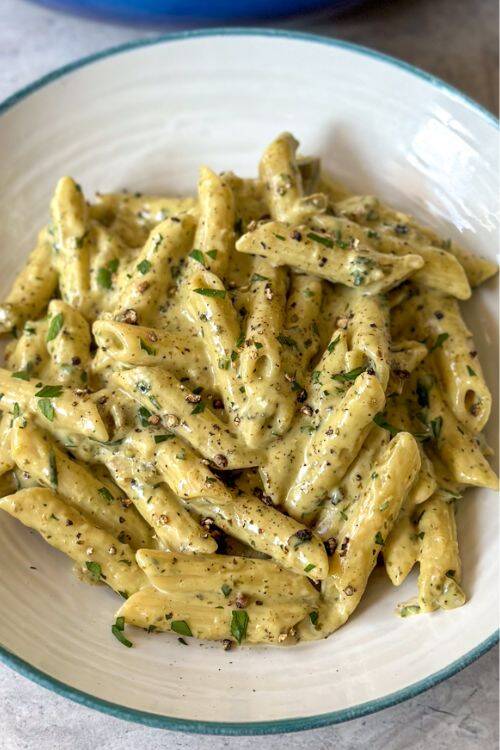 The ingredients include penne pasta, garlic powder, all purpose flour, pesto sauce and onion.