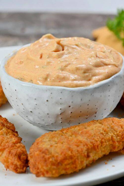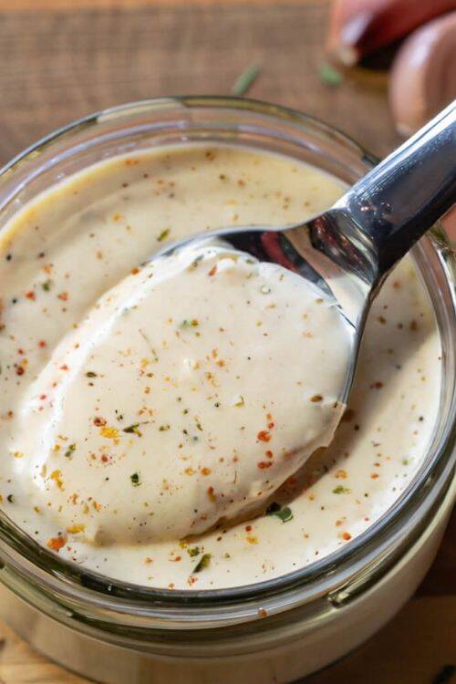 It hardly takes 5 minutes to make. The ingredients include low-fat mayonnaise, garlic powder, paprika, onion powder and mustard.