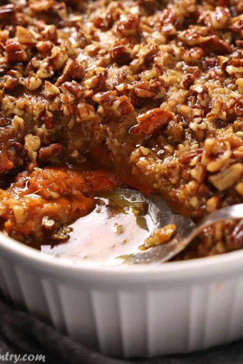 The ingredients include sweet potatoes, vanilla extract, butter, evaporated milk and eggs. Top it up with pecans.