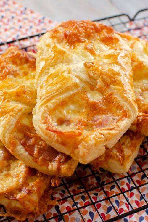 The ingredients include puff pastry, bacon, egg and cheddar cheese.